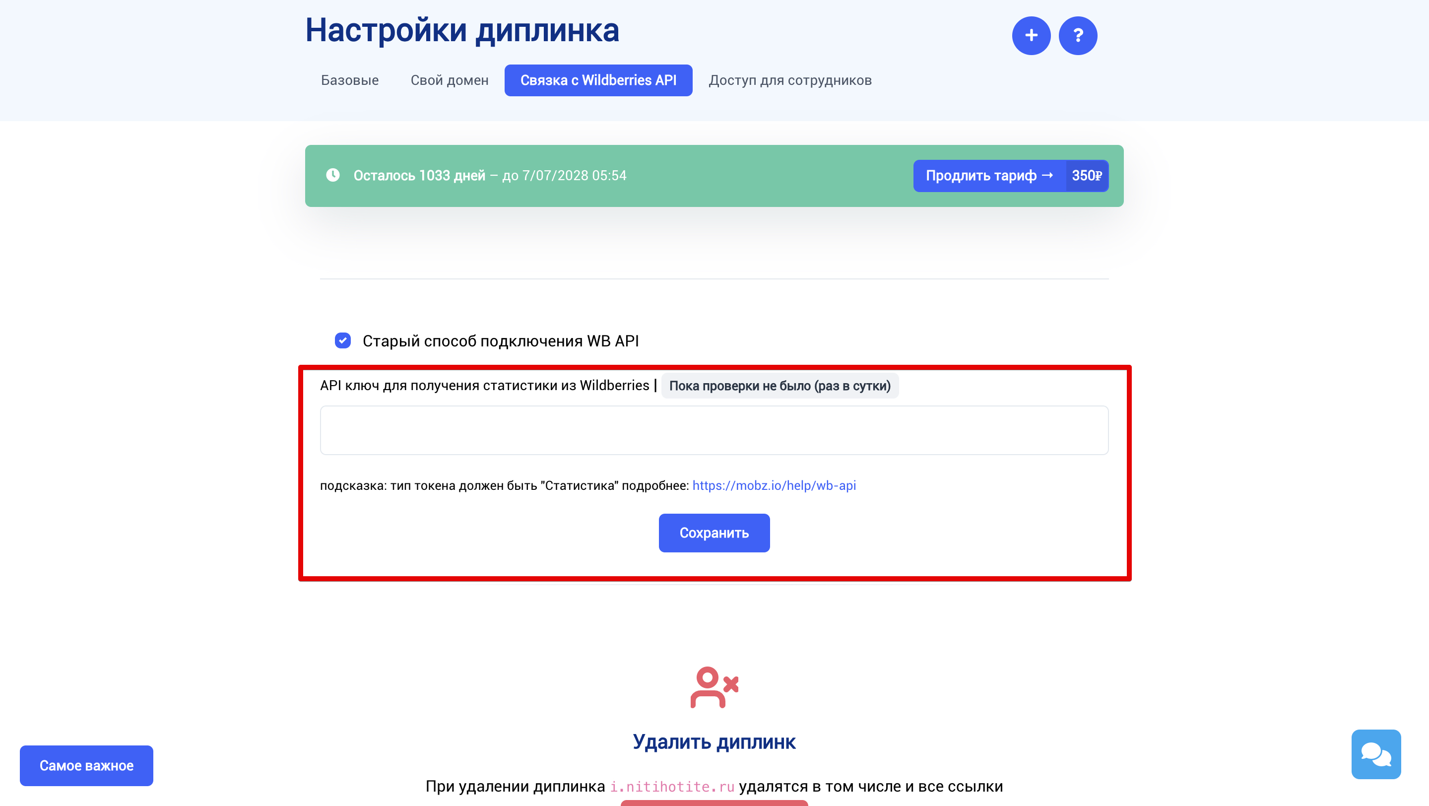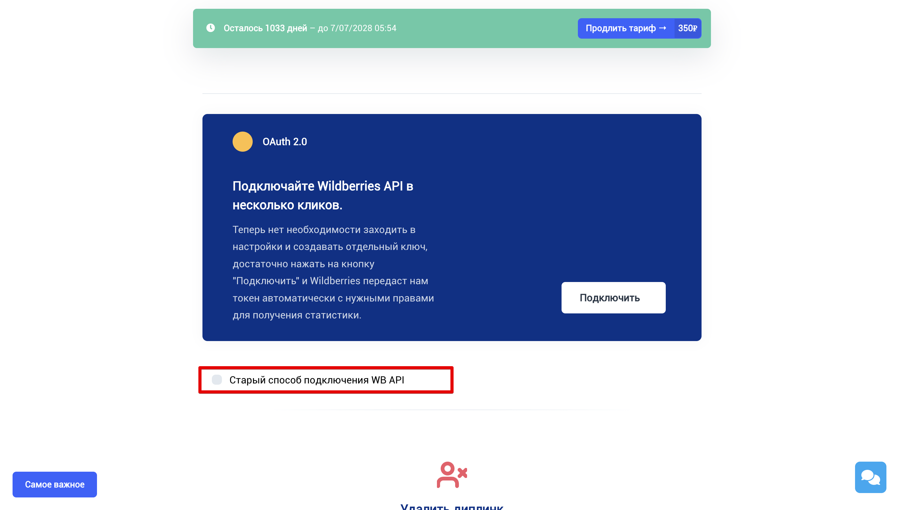 4. Выберете пункт "Связка с Wildberries API", дальше нужно выбрать "Старый способ подключения WB API" тут нужно добавить ваш ключ, не забудьте нажать на кнопку "Сохранить":